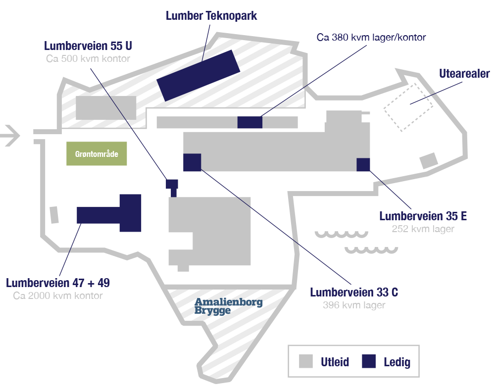 Lumber Næringspark rommer flere titalls bedrifter innen kontor, lager, produksjon, og publikumsrettede virksomheter. Vi har ledige lokaler til flere bedrifter. (Se illustrasjon)
